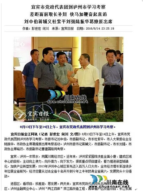 8月14日上午,宜宾市党政代表团一行60余人,在宜宾市委书记刘中伯,市委副书记、市长杜紫平,市人大常委会主任陆振华,市政协主席葛燎原领导下,莅临泸州金融商业中心聚彩堂世纪城考察。泸州市委书记蒋辅义,市委副书记、市长刘强,市政协主席喻双,市委副书记曹建国等市领导陪同考察。